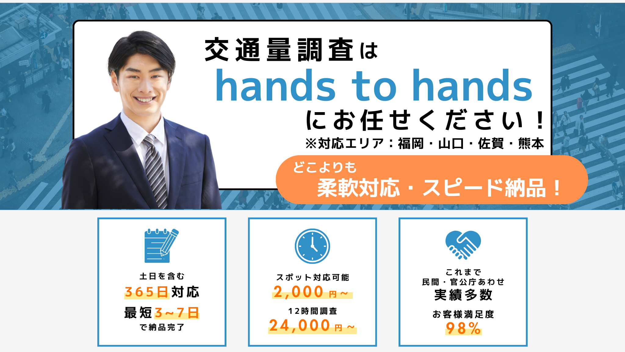 A. 調査の場所、時間帯、計測する対象(車両、歩行者、自転車など)を確認させて頂き、御見積書を作成させて頂きます。